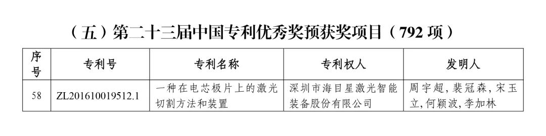 近日,國家知識產權局發布第二十三屆中國專利獎的評審結果公示,深圳市海目星激光智能裝備股份有限公司的《一種在電芯極片上的激光切割方法和裝置》榮獲中國專利優秀獎